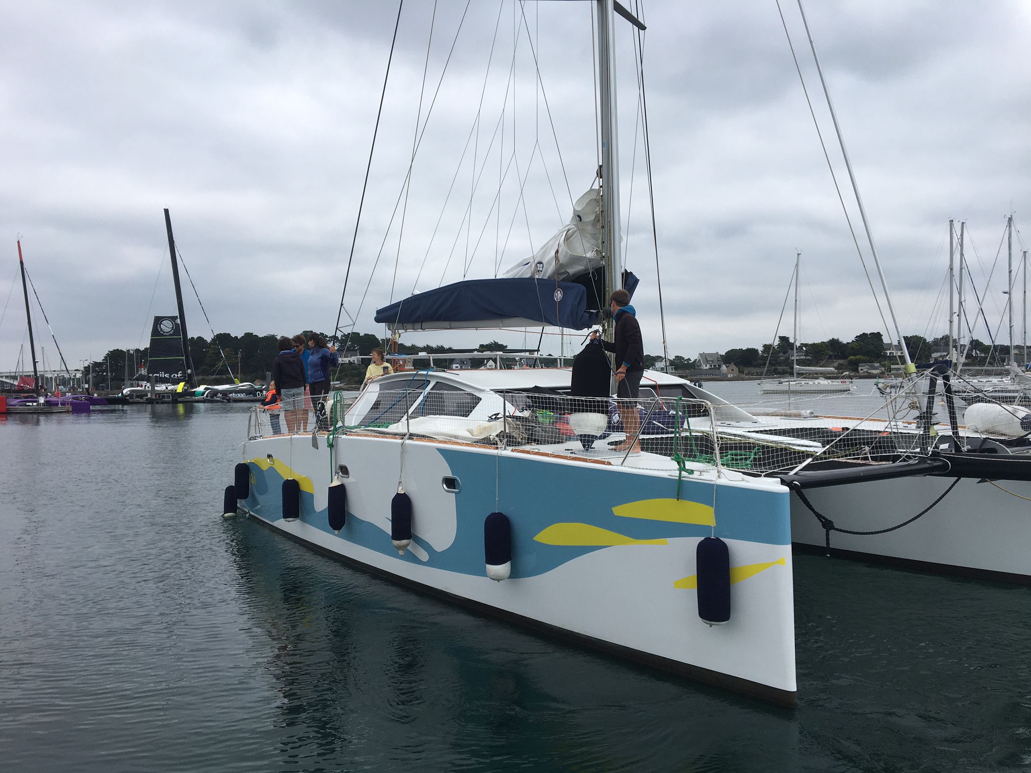 Fred Duthil, dirigeant de Technique Voile est venu à bord avec le maître-voilier le temps d’une petite navigation, histoire de valider quelques réglages. Nous avons également réceptionné notre lazy bag. Nous avons bien hésité entre les couleurs  jaune et bleu mais finalement, nous l’avons pris bleu « Abyss » et il s’avère MA-GNI-FIQUE ;-); il donne une touche de finition et d’embellissement qui nous plaît bien.