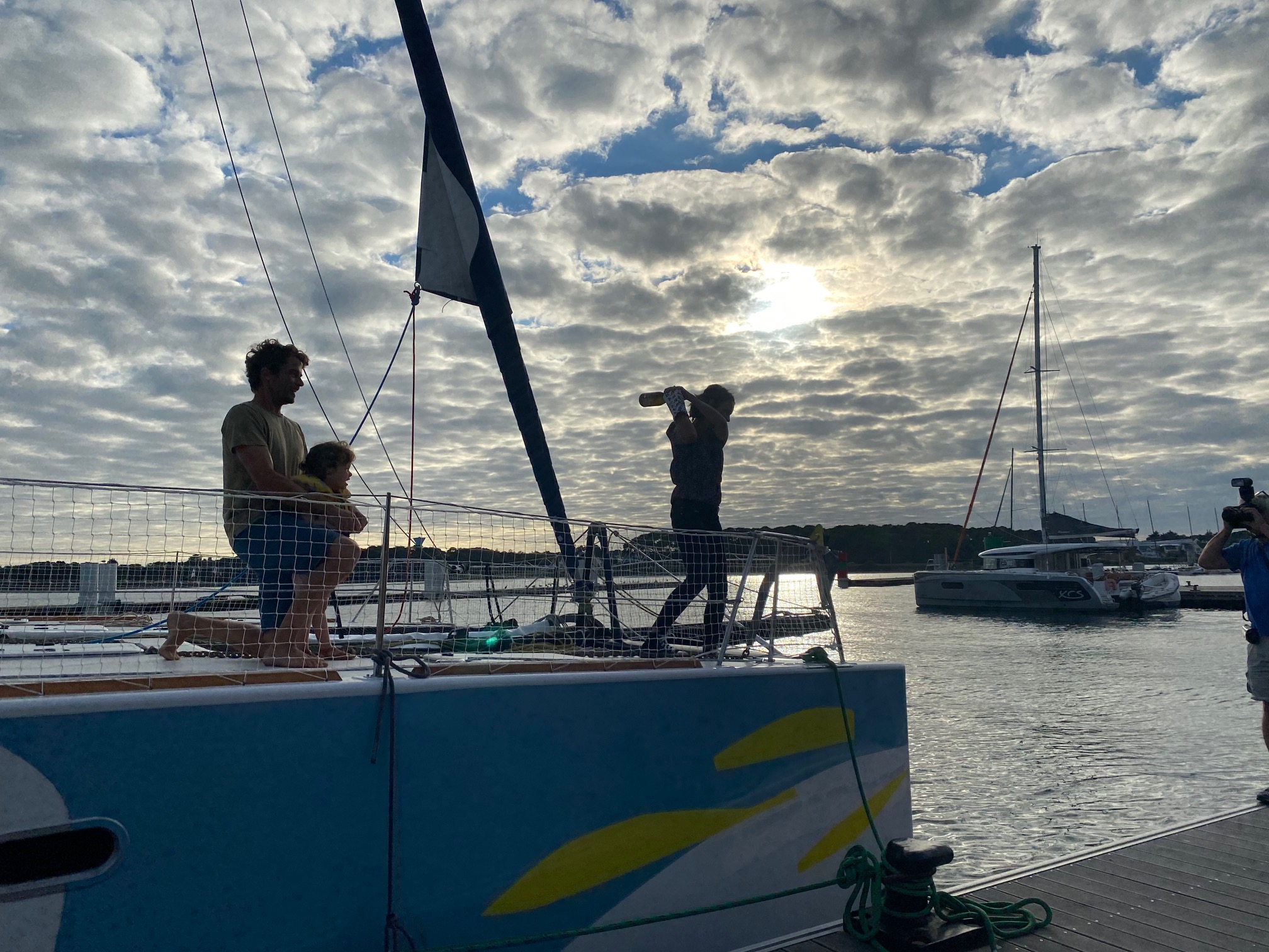 Samedi 11 septembre, à 18h30, nous baptisions Zaï Zaï au port de la Base ! Sabrina Millien, marraine du bateau, s’est assurée d’exploser littéralement la bouteille sur son étrave, pour être tout à fait certaine de lancer son filleul sur la voie de l’aventure !